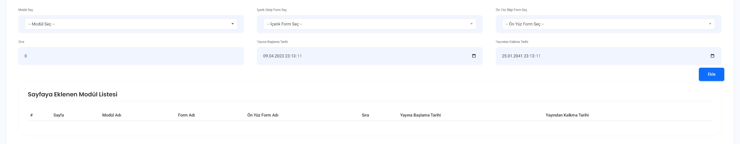 Sayfalar listesinde yer alan Modül / Ekle Düzenle Butonu ile sayfaya yeni modüller eklebilirsiniz