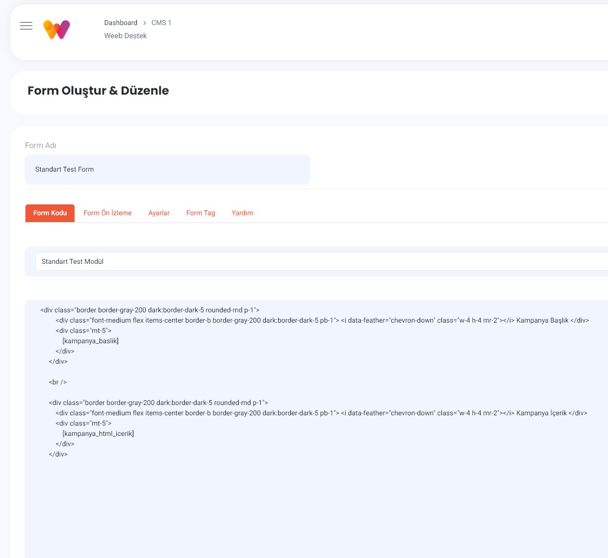 Standart Modül içinde Sistem Taglarını Kullanabilirsiniz. Sistem Taglarını forma eklemenize gerek yoktur. bkz: Sistem Tag Listesi