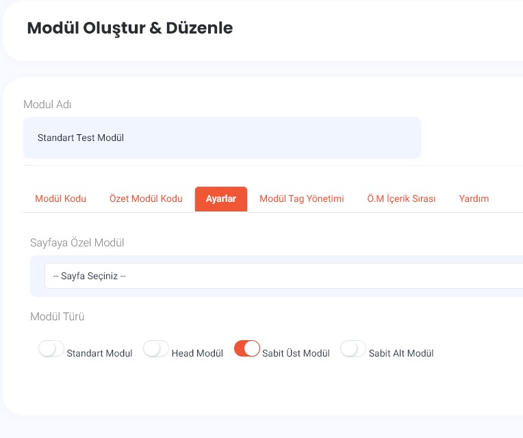 2-Head Modül : Tüm sayfalarda head alanına veri eklemek için kullanılan ve sadece sistem taglarını okuyan modüldür. Form eklenmez. Sistem Meta tagları bu alana otomatik olarak eklenir.