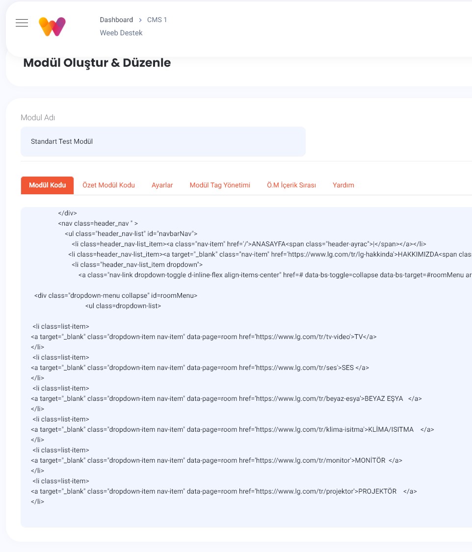HTML kodların içinde başka değişiklik yapılmasına gerek yoktur, modül taglar eklendikten sonra Modül isim verilerek kayıt edilmesi yeterlidir. (ayarlardan Standart modül Seçilmelidir)