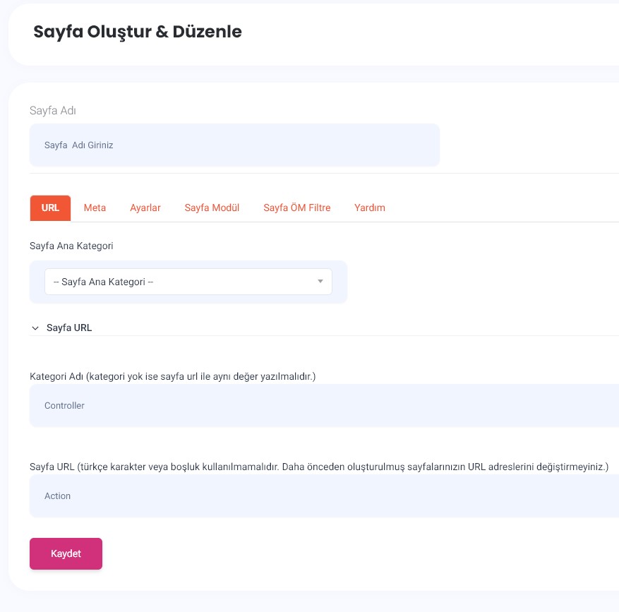 Sayfa URL: Sayfanız için url otomatik oluşacaktır, url içinde boşluk veya türkçe karakter olmamalıdır.