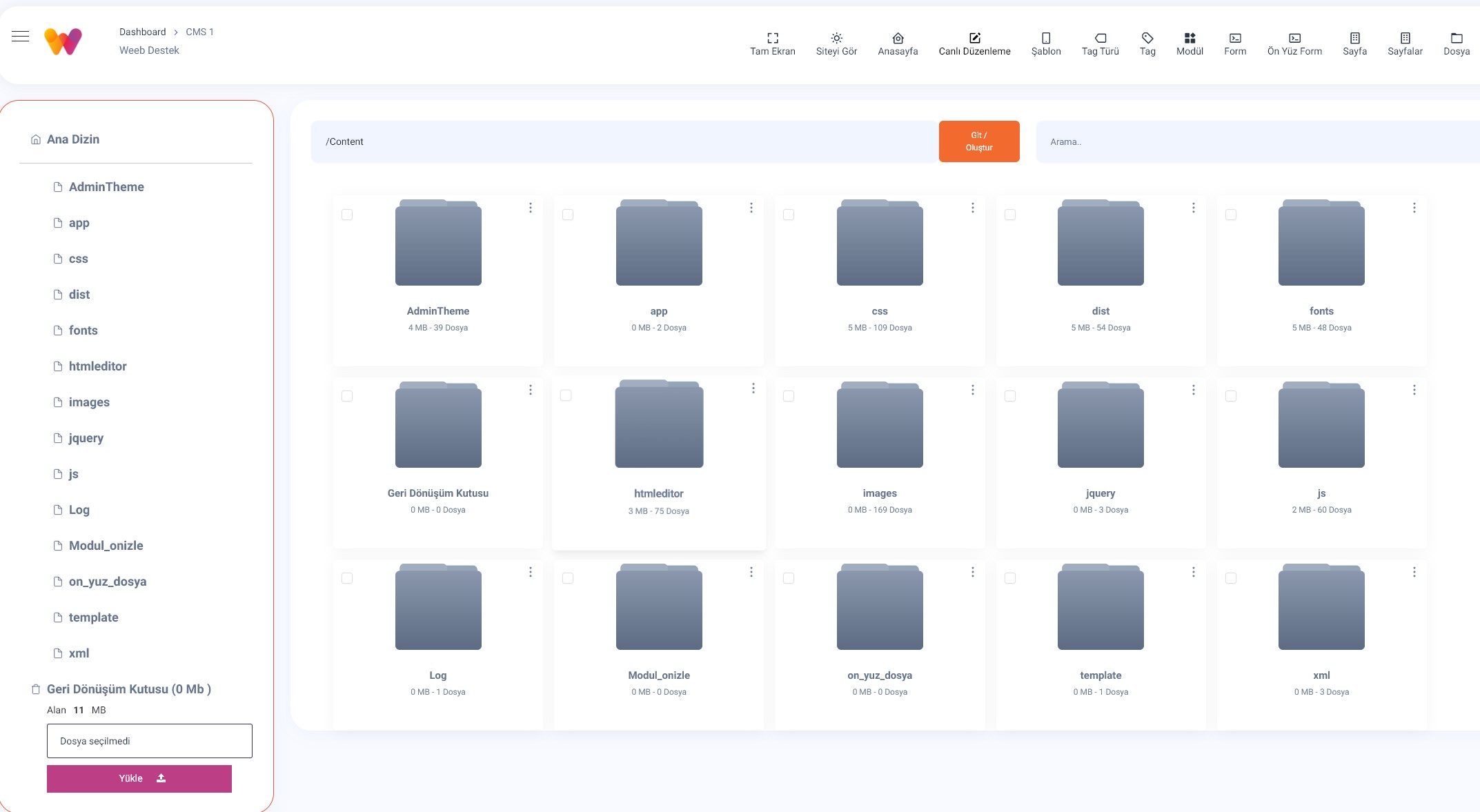 Wa Dosya yönetim paneli sayesinde projenizde gerekli olan dosyaları yüklebiliriniz. çoklu dosya yüklemek için *.zip formatı kullanmalısınız. Zip formatını yükleme sonrası çıkartma yapabilirsiniz.