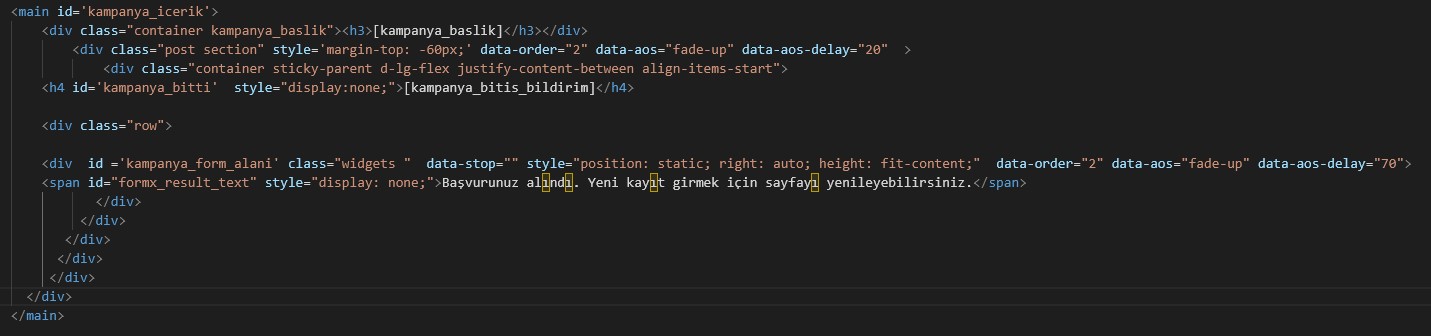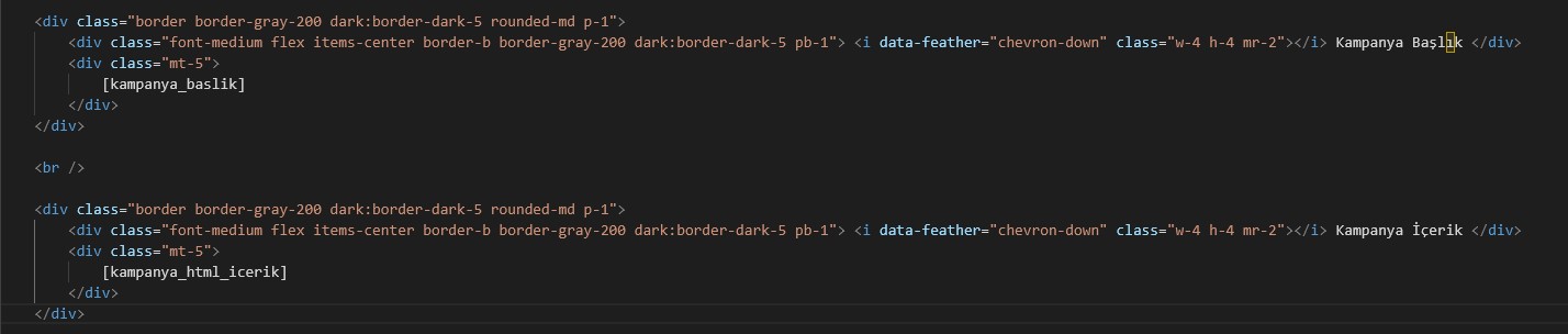 Yukarıdaki örnekte görüldüğü gibi HTML kodların içine içeriklerin gelmesini istediğimiz Tagları [kampanya_baslik] örneği gibi ekliyoruz.