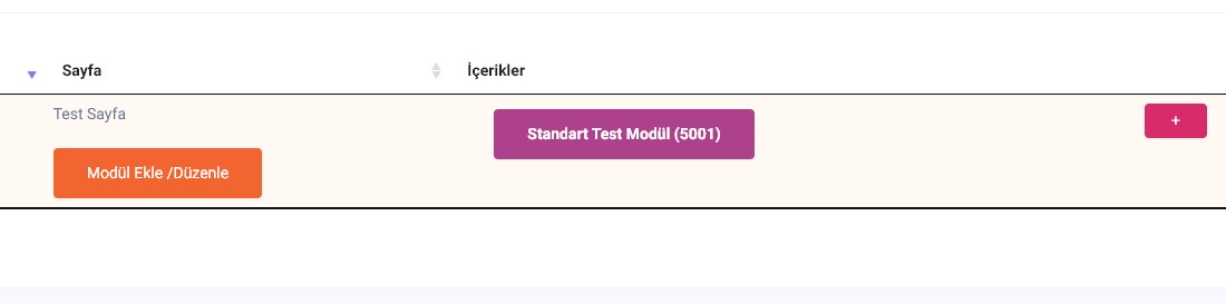 Sayfalar listesinde yer alan Modül / Ekle Düzenle Butonu ile sayfaya yeni modüller eklebilirsiniz